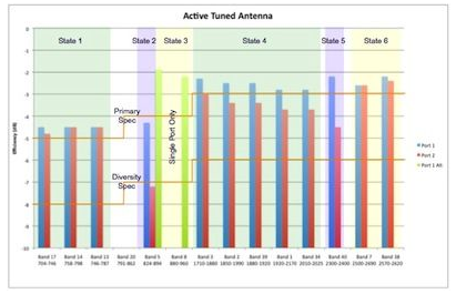 為了緩解各種使用模型的影響,有必要將狀態調諧和模式隔離兩種方法結合運用。模式隔離允許具有多個饋點的單天線結構執行多個MIMO天線的功能;而狀態調諧則允許這種結構非常小,但仍然能夠非常高效地在寬頻率範圍內工作。圖5顯示了以6個調諧狀態覆蓋多個頻段的可變狀態iMAT天線結構的平均測量效率。iMAT結構能在平衡或不平衡的增益配置下工作,並且與傳統天線設計技術相比,能以更小的封裝提供更高的性能。