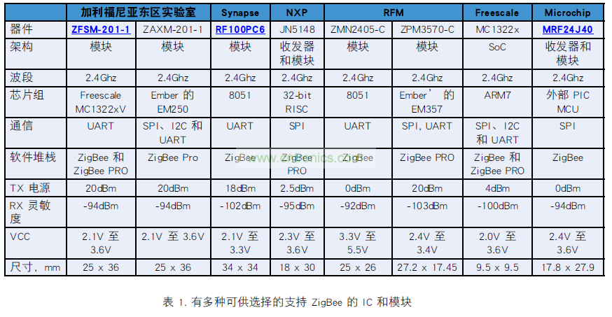 IC 和模塊中都提供有 ZigBee 解決方案(見表1)。 商業使用本規範不收取費用 - 製造商必須屬於 ZigBee 聯盟,最終產品必須