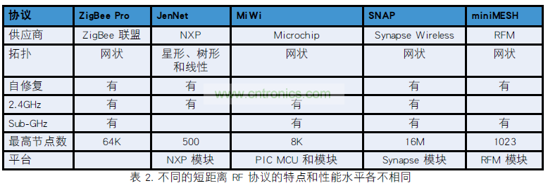 使用芯片製造商開發的專有協議可免去 ZigBee 許可證費(見表 2)。 NXP 提供 JenNet 協議,該協議在 2.4GHz 波段內運行,能組建樹狀、星狀和線性自修複網絡,最高包含500 個節點。 Microchip 的免費 MiWi 堆棧同時以 sub-GHz和 2.4GHz 兩種頻率,在 PIC 微控製器和 Microchip 收發器上運行。