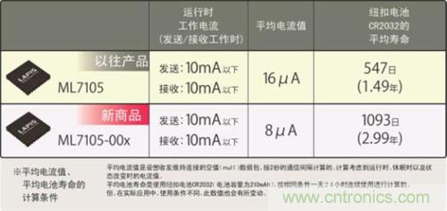 LAPIS Semiconductor去年推出的“ML7105”,實現了業界頂級的低耗電量(收發數據包時的運行狀態)。此次開發出的新品“ML7105-00x”,不僅保持了運行狀態下的低耗電量性能,而且平均電流還減少了一半。所謂平均電流,是指按一定間隔反複收發數據包時的運行狀態(耗電量大)與休眠狀態(耗電量小)的平均電流值。通過大幅減少改變狀態所需的時間,使平均電流減半,從而使電池壽命可達2倍。因此,按LAPIS Semiconductor的工況條件,支持Bluetooth® Low Energy的、使用紐扣電池(CR2032)的設備其電池壽命即使在24小時連續工作的條件下,也可充分使用2年。