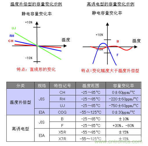 陶瓷電容器如圖2所suo示shi,可ke分fen為wei溫wen度du補bu償chang型xing與yu高gao誘you電dian型xing。由you於yu各ge種zhong溫wen度du條tiao件jian下xia的de靜jing電dian容rong量liang變bian化hua情qing況kuang各ge不bu相xiang同tong,因yin此ci需xu要yao根gen據ju電dian容rong的de特te點dian來lai確que定ding其qi用yong途tu。日ri本ben國guo內nei所suo采cai用yong的deJIS規格、歐洲所采用的EIA規格均做出了詳細的分類