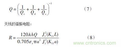 本設計采用同軸饋電的方式,是通過在輻射貼片上的饋電點位置不同來改變輸入阻抗,使天線獲得阻抗匹配。一般的微波器件通用的是50 Ω係統,所以需要通過改變饋電點的位置來使天線達到50 Ω的輸入阻抗。計算天線的輸入阻抗,需要從介質損耗、輻射損耗、導體損耗、表麵波損耗幾個方麵考慮,不能單方麵考慮某一因素,否則會引起很大的誤差。Qr,Qc,Qd,Qs分別是輻射損耗、導體損耗、介質損耗和表麵波損耗所引起的相應Q 值。