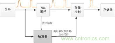 這就要靠觸發係統來實現。觸發的原理是一直監控信號流,若發現信號滿足設定的觸發條件,觸發器記錄滿足條件的信號,啟動采樣;待數據采集完畢後,由控製器對信號進行處理和顯示。具體如下圖1所示。