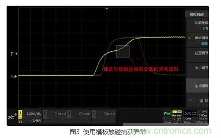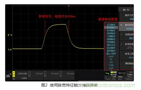 通過Step1,可以大概了解到異常信號的特性,將其特有的條件視為觸發條件,利用觸發可快速的捕獲異常信號。ZDS2000係列示波器免費標配了多種“觸發類型”,其中包括11種基礎觸發,21種協議觸發。另外,用戶還可根據波形的形狀特性,使用“模板觸發”,讓觸發更加隨心所欲。