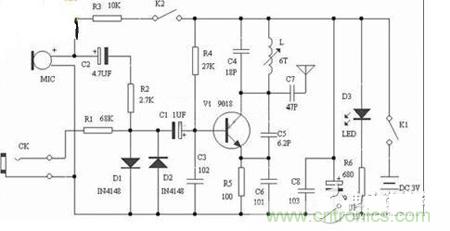 【導讀】FM調頻發射機,發射頻率在模擬廣播波段88~108Mhz,用普通FM收音機接收,2種音信輸入,MIC頭將周邊聲音發送,CK音信輸入,調校可調發射線圈L可改變(微調)發射頻率。