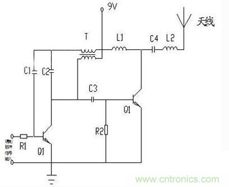 如圖所示是無線發射器原理電路圖,Q1是共發射極變壓器耦合振蕩電路:負載是變壓器T的衩級線圈,集電極輸出信號經T耦合後,由次極經C1送基極,構成正反饋,起振。基極同時送入低頻調製信號,對產生的高頻振蕩進行幅度調製。