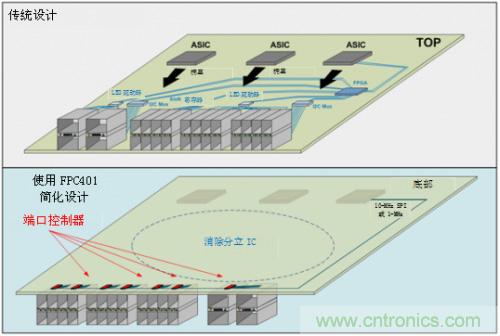 為了管理所有這些信號,典型的設計實施涉及高引腳數現場可編程門陣列(FPGA)、I2C多路複用器、移位寄存器、LED驅動器和額外的印刷電路板(PCB)層。這些方法難以實施,電路板很擁擠,並且不易擴展——直到現在,都是如此。TI的FPC401四端口控製器為這一設計挑戰提供了更簡單的解決方案。