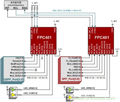 FPC401將多達56個端口的所有低速信號集成到單個快速I2C總線(高達1MHz)或串行外設接口(SPI)總線(高達10 MHz)中,大大降低了線路複雜性並簡化了設計可擴展性。FPC401四個端口中的每一個端口都具有三個輸入、四個輸出和一個I2C主機,從而實現對下遊模塊的完全控製。有關SFP和QSFP連接的示例,請參見圖2。