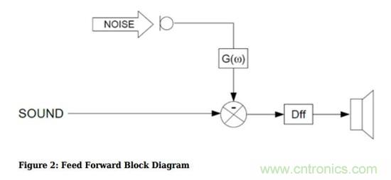 如果把係統畫成信號流圖,就是下圖,噪聲在麥克風采樣後進入信號處理電路,產生“反”噪聲,並與音樂一起送進耳機內。這種模式稱為前饋有源噪聲消除。
