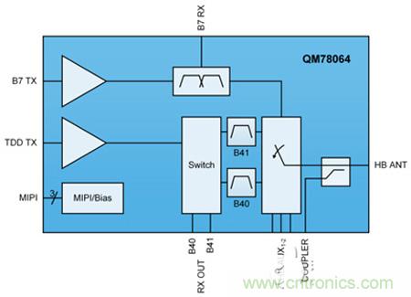 圖 1 所示為 RF Fusion QM78064 高頻段模塊,它同時支持 FDD-LTE(帶有集成頻段 7 雙工器)和 TDD-LTE(頻段 40 和 41),並搭載一個支持 20 MHz + 20 MHz 上行載波聚合的寬帶 B41 LowDrift™ BAW 濾波器。該模塊還配備一個天線開關並支持包絡跟蹤 (ET) 和平均功率跟蹤 (APT),以盡可能減少能源消耗。
