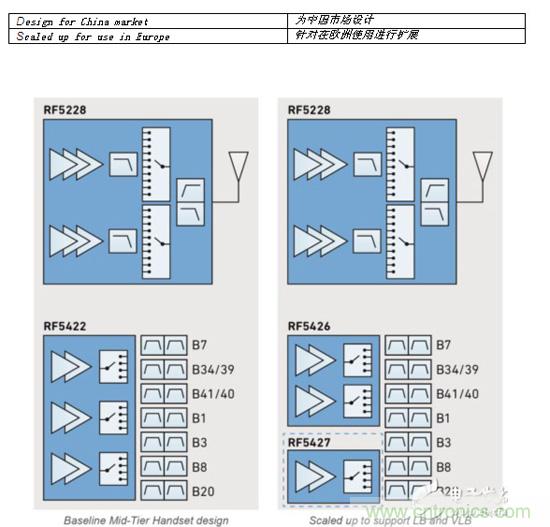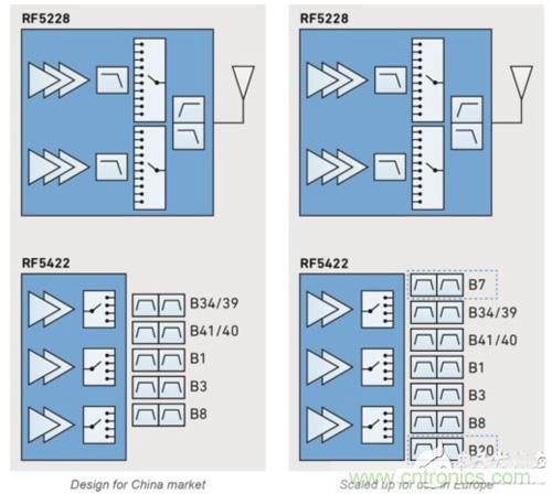 場景 1 製造商設計了一款采用 RF5422 多頻段 PA 模塊和 RF5228 高級發送模塊的中端手機。RF5422 提供所有必要的 3G 和 4G PA 功能;RF5228 為所有頻段提供 2G 支持和天線開關功能。針對中國市場,製造商添加了濾波器以支持 1、3、8、34、39、40 和 41 頻段。通過簡單添加頻段 7 和 20 的濾波器,即可針對歐洲的使用來對相同設計進行擴展。製造商可以在兩個區域使用相同的 PCB 設計,並根據需要在 PCB 中添加濾波器。