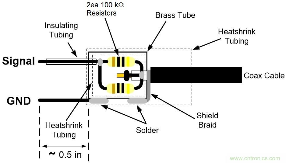 圖1:1000:1、 50Ω電壓探頭使用兩個100kΩ電阻並聯,比使用單個50kΩ電阻的功率耗散能力增加了一倍。