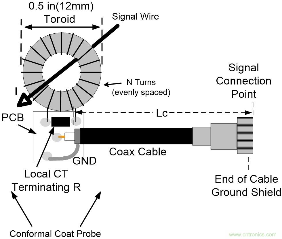 圖2所示的電流探頭使用SMD電阻,這就是為什麼需要一個小PCB來安裝它並固定到同軸電纜的末端。務必保形塗覆整個電流互感器組件;繞組非常脆弱,同軸電纜會給電流探頭帶來很大的機械應力。