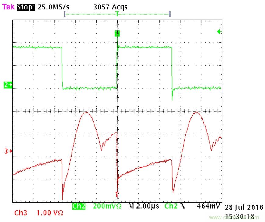 圖5:電流探頭會因為時間常數使輸入信號失真。上部(綠色)跡線為幹淨的VDS,下部(紅色)跡線為失真的ID。