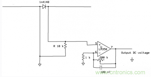 DC的輸出電壓還可以用LM358上的另一個運放在進行一次放大。圖中的100nF電容起到對整流後的電信號進一步濾波的作用。