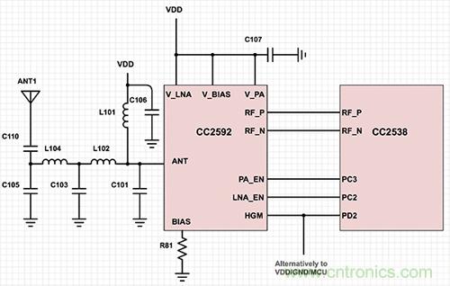 圖 2: 將 CC2592 增程器與 CC2538 射頻 SoC 配合使用非常簡單。在這種布局中,天線和匹配電路直接連接到增程器而非射頻 SoC。(使用 Digi-Key Scheme-it? 繪製的原理圖。圖片來源:Texas instruments)