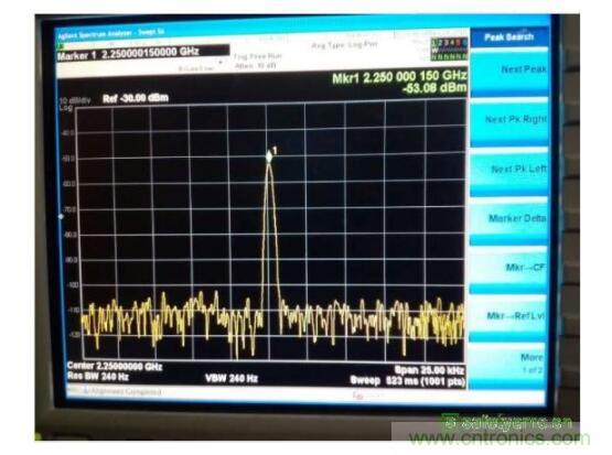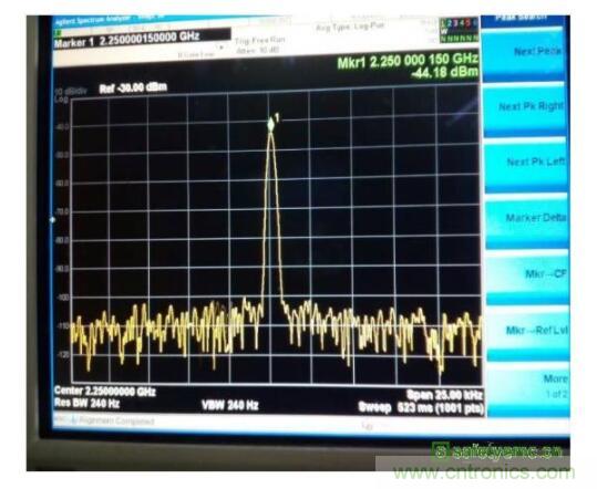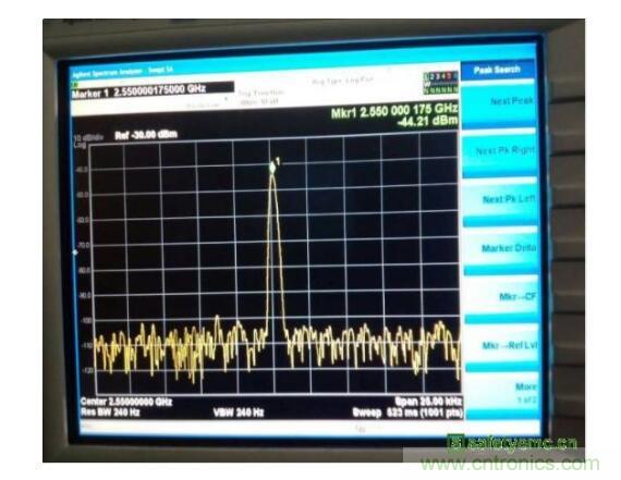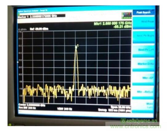從cong測ce試shi結jie果guo來lai看kan,諧xie波bo超chao標biao很hen嚴yan重zhong,這zhe一yi點dian與yu天tian線xian區qu域yu的de雜za訊xun信xin號hao很hen相xiang似si,考kao慮lv到dao傳chuan導dao嫌xian疑yi已yi經jing排pai除chu,因yin此ci分fen析xi的de重zhong點dian集ji中zhong到dao了le天tian線xian區qu域yu的de非fei線xian性xing器qi件jian。從cong如ru圖tu4所示原理圖可以看出,天線的調諧開關是正常工作的,由於天線開關本身是非線性器件,因此首先確認天線開關的影響。將天線開關旁路(天線仍然正常)如圖5所示,發現此時2.55GHz的雜訊可以降低到-55.7dBm左右,因此可以確定天線區域的雜訊就是調諧開關造成的。