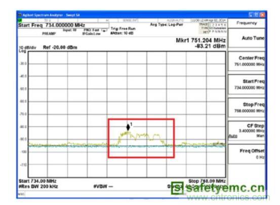 經過查閱電源和芯片文檔得知其開關頻率的大約為1.9M,gaipinlvchengfendedianyuanzaoshenghuizaitiaozhiguochengzhongpinyidaoxinhaopinlvliangce。raneryouyushiyongjiaodilingmindudetantouzhinengquedingchubanshangxiabanbufendoushikenengdefushezasanxinhaoyuan,quewufadingweijingquedeweizhi。cishiwomenxuyaojinyibushiyongtaojianzhongjingdugenggaodecichanghuanxingtantouhuozhechuizhixiangcichangtantoulaiquedingzuiqiangquyu。zuizhongfaxianzai750MHz+/-17MHz在紅色框標示區域最強。測試結果請參考圖7所示,此處750MHz附近的近場輻射為-83.21dBm,2.25GHz處最大近場輻射為-44.18dBm。
