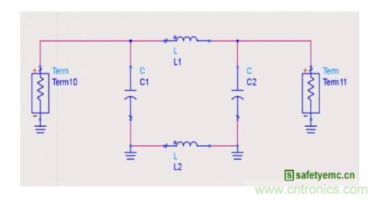 由於2.25GH大約是750MHz的三次諧波,因此我們首先針對750MHz做濾波設計。為了克服這種幹擾應該對基帶信號加以濾波,阻止高頻成分傳播和搬移。如圖8所示是一種推薦電路,其中電容C1、C2和L2可作為備選,將此電路加在圖6黃色框圖標示的電源入射端口附近做濾波。