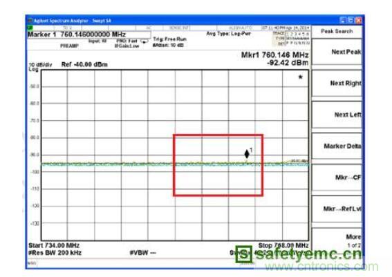 采用此濾波方案後的再進行近場掃描Max Hold的結果可參考圖9所示近場輻射結果,此處750MHz附近的近場輻射已經下降到了-92.42dBm,2.25GHz處最大近場輻射下降到了-53.08dBm: