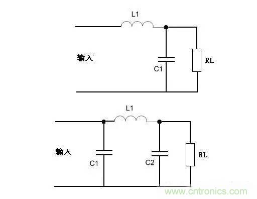 根據電抗性元件對交、直流阻抗的不同,由電容C及電感L所組成的濾波電路的基本形式如圖1所示。因為電容器C對直流開路,對交流阻抗小,所以C並聯在負載兩端。電感器L對直流阻抗小,對交流阻抗大,因此L應與負載串聯。