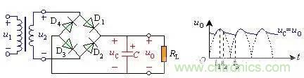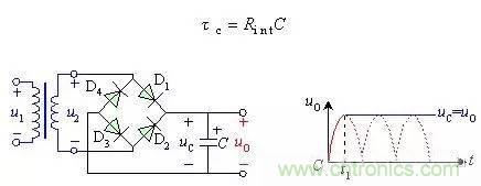 式中包括變壓器副邊繞組的直流電阻和二極管的正向導通電阻。由於一般很小,電容器很快就充到交流電壓u2的最大值,如波形圖2(b)的時刻。此後,u2開始 下降,由於電路輸出端沒接負載,電容器沒有放電回路,所以電容電壓值uC不變,此時,uC>u2,二極管兩端承受反向電壓