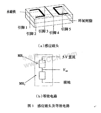 用銻化銦-銦共晶體薄膜磁阻元件製成MRCS的感應磁頭(圖1)主要由導線、絕緣基片、InSb-In磁阻元件MR1和MR2、永磁體、5個引腳等組成,另外加上起屏蔽和保護作用的金屬外殼。MR1和MR2是相對放置的一對磁阻元件,其阻值大致相等,導線置於MR1和MR2的對稱軸位置。其等效電路如圖1(b)。