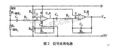 信號采集電路中的InSb-In薄膜磁阻元件采用三端差分型接法如圖1(b)所示,這種信號采集電路具有輸出信號較大和較強抑製溫漂的能力。信號處理電路采用阻容耦合型差動放大電路,在圖2中IC1和IC2為兩級差動放大,改變R2,R7,R5,R8的阻值可以調整放大倍數。集成運放的靜態電壓由R3和R6來調節,考慮到通常磁頭內的上、下兩個磁阻元件不完全平衡,MR1與MR2的阻值會有10%以內的差別,在+5 V的工作電源下,信號采集的輸出端電壓在2.4~2.6 V。為了減少信號在磁頭與運放之間阻容耦合中的損失,一般把集成運放靜態電壓設置為低於2.5 V,取2 V比較合適。
