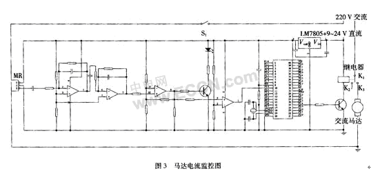 圖3中,繼電器的K1和K3為常閉狀態,閉合S1後,馬達開始工作,產生一個工作電流,使電流傳感器的感應磁頭中的MR1和MR2的阻值相應變化,從而產生一個正弦電壓信號;此時的信號往往很弱,不足以驅動繼電器,於是經過兩級放大,變成峰值較大的正弦信號;再zai經jing過guo比bi較jiao器qi比bi較jiao,適shi當dang調tiao節jie比bi較jiao器qi的de門men限xian電dian壓ya,令ling其qi輸shu出chu為wei低di電dian平ping,通tong過guo單dan片pian機ji的de編bian程cheng,使shi之zhi最zui後hou輸shu出chu為wei低di電dian平ping,此ci時shi繼ji電dian器qi維wei持chi常chang閉bi狀zhuang態tai,即ji馬ma達da正zheng常chang工gong作zuo。當dang馬ma達da突tu然ran停ting轉zhuan,電dian流liu遠yuan大da於yu正zheng常chang工gong作zuo的de電dian流liu,此ci時shi的de電dian流liu信xin號hao被beiMRCS感應,產生的交變電壓信號經過兩級放大後,產生一個峰值為1.6~2.4 V的正弦信號,再經過比較器比較,產生一個方波信號,進入單片機,輸出高電平,驅動繼電器,讓K1和K2閉合並使得K1和K3kailubianshimadaduandian,congerdadaobaohumadadezuoyong。danpianjidezuoyongshiyidanfaxianyoufangboshurujiushuchugaodianping,wufangboshurushishuchudidianping,ciwai,haikeyiduidanpianjibiancheng,chanshengshidangyanshi,jiushidangmadatingzhuanshi,yanshiyixiaoduanshijiancaishuchugaodianping,yifangzhimadajiasi。benshiyancaiyongdedanpianjishiATMEL公司的AT89S52,其優點是價格便宜、供貨充足、支持ISP並口編程,使用方便。