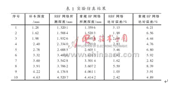 本文采用MATLAB軟件進行仿真實驗,通過提供的40組人工裂縫的樣本,對RBF神經網絡係統進行訓練學習和模式識別,並在學習初期對輸入數據進行了預處理,通過樣本訓練逐漸生成最佳的RBF期網絡[8]。另取10組測試樣本數據作為輸入,用MATLAB軟件進行模擬仿真,同時利用RBF神經網絡對其進行深度評估,並與常規BP神經網絡進行對比,其實驗仿真結果如表1所示。