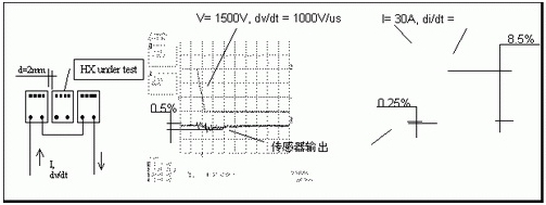 開關設備每次開關時產生的高dv/dt值將在主電纜和傳感器的電子電路之間產生電容電流。大多數模擬線性放大器對這種寄生電流很靈敏。因此,dv/dt噪(zao)聲(sheng)將(jiang)被(bei)疊(die)加(jia)在(zai)輸(shu)出(chu)信(xin)號(hao)上(shang)。根(gen)據(ju)變(bian)動(dong)電(dian)壓(ya)的(de)幅(fu)度(du)和(he)斜(xie)坡(po),初(chu)始(shi)尖(jian)峰(feng)和(he)後(hou)來(lai)的(de)振(zhen)蕩(dang)有(you)時(shi)會(hui)非(fei)常(chang)高(gao),以(yi)致(zhi)它(ta)們(men)會(hui)激(ji)活(huo)傳(chuan)感(gan)器(qi)的(de)電(dian)流(liu)保(bao)護(hu)電(dian)路(lu),進(jin)而(er)使(shi)逆(ni)電(dian)器(qi)暫(zan)停(ting)運(yun)轉(zhuan)。LEM的經驗在HX係列設計階段幫助保證了對關鍵噪聲的完美免疫力,而又不會損害帶寬,因此HX的性能要超過其它類似的傳感器(圖2和圖3)。