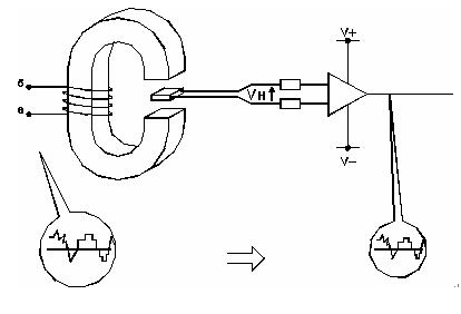 圖1.位於磁性電路間隙中的霍爾發生器把一次電流產生的磁場轉換成成比例的霍爾電壓