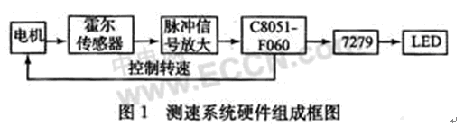 本係統采用單片機C8051F060作為主控製器,使用霍爾傳感器測量電機的轉速,通過7079最終在LED上顯示測試結果。此外,還可以根據需要調整控製電機的轉速,硬件組成由圖1所示。