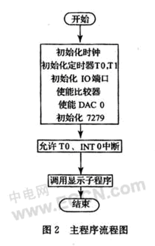控製器C8051F060主要完成轉速脈衝的采集、16為定時計數器計數定時、運算比較,片內集成的12位DAC0控製轉速,並且通過7279顯示接口芯片實現數碼顯示等多項功能。係統采用外部晶振,係統時鍾SYSCLK等於18432000,T0定時1 ms,初始化時TH0=(-SYSCLK/1 000)》8;TL0=-SYSCLK/1 000。等待1 s到,輸出轉速脈衝個數N,計算電機轉速值。將1 s內的轉速值換算成1 min內的電機轉速值,並在LED上輸出測量結果。