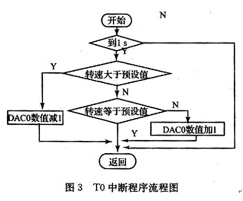 本係統采用C8051F060中的INT0中斷對轉速脈衝計數。定時器T1工作於外部事件計數方式對轉速脈衝計數;T0工作於定時器方式均工作於方式1。每到1 s讀一次計數值,此值即為脈衝信號的頻率,根據式(1)可ke計ji算suan出chu電dian機ji的de轉zhuan速su。由you於yu直zhi流liu電dian機ji的de轉zhuan速su與yu施shi加jia工gong於yu電dian機ji兩liang端duan的de電dian壓ya大da小xiao有you關guan,故gu將jiang實shi際ji測ce得de的de轉zhuan速su值zhi與yu預yu設she的de轉zhuan速su值zhi比bi較jiao,若ruo大da於yu預yu設she的de轉zhuan速su值zhi則ze減jian小xiaoDAC0的數值,若小於轉速預設的轉速值則增加DAC0的值調整電機的轉速,直到轉速值等於預設定的值,這樣就實現了對電機轉速的控製,主程序和T0中斷流程圖如圖2、3所示。
