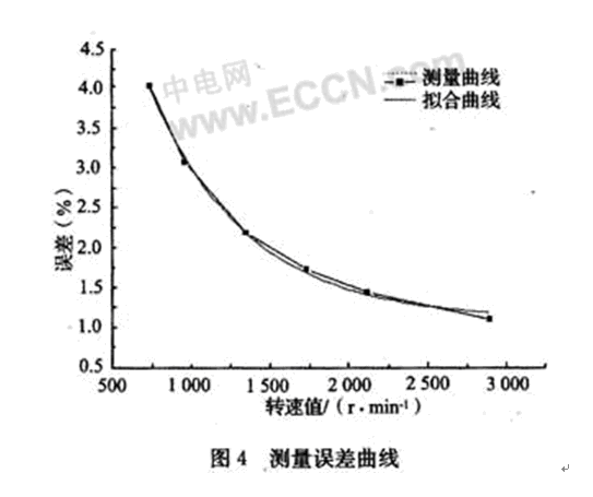 首先在軟件中給出轉速預設值,即給定常量speed的值,觀察速度穩定後七段數碼管的數值,比較實際測量的轉速值和預設轉速值,計算測量誤差,評價測量的準確性,測試結果如表1所示。根據實驗測試和誤差分析繪製了測量誤差曲線,如圖4所示。誤差分析表明,轉速測量誤差在5%以內,並且隨著轉速預設值的增加測量誤差愈小,呈指數形式下降,函數關係如式(3)所示。