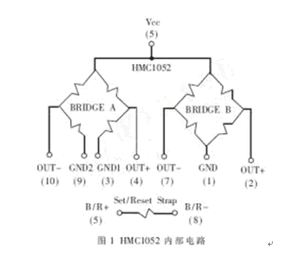 HMC1052shiyigeshuangzhouxianxingcizuchuanganqi,meigechuanganqidouyouyigeyoutieniebomohejinzuchengdehuisidunqiao。dangqiaolujiashanggongdiandianyashi,chuanganqijiangcichangqiangduzhuanhuaweidianyashuchu。HMC1052包含兩個敏感元件,它們的敏感軸相互垂直,且參數相互匹配。內部電路如圖1所示。