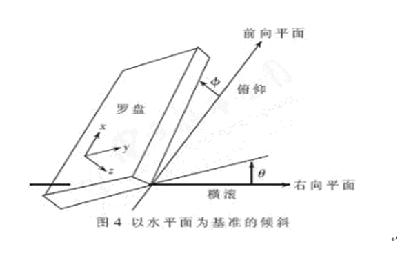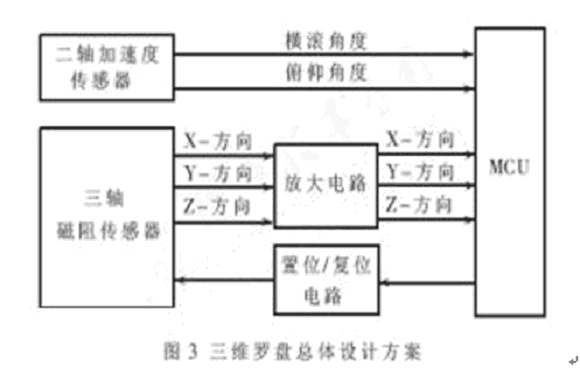地球磁場的強度為0.6高gao斯si左zuo右you,現xian有you的de磁ci阻zu傳chuan感gan器qi可ke以yi很hen好hao地di測ce量liang地di磁ci場chang範fan圍wei內nei的de磁ci場chang強qiang度du。由you於yu二er維wei羅luo盤pan隻zhi能neng在zai保bao持chi水shui平ping的de情qing況kuang下xia正zheng常chang工gong作zuo,如ru果guo用yong於yu車che輛liang的de動dong態tai環huan境jing中zhong,將jiang不bu可ke能neng保bao證zheng其qi永yong遠yuan水shui平ping,所suo以yi在zai這zhe種zhong場chang合he下xia,羅luo盤pan的de可ke使shi用yong性xing大da大da降jiang低di。於yu是shi需xu要yao設she計ji三san維wei羅luo盤pan以yi適shi應ying各ge種zhong姿zi態tai的de測ce量liang。三san維wei電dian子zi羅luo盤pan的de總zong體ti設she計ji方fang案an如ru圖tu3所示。三軸磁阻傳感器分別從X、Y、Z 三個磁場強度方向輸出電壓,經過放大電路分別輸入到三個具有A/D轉換能力的MCU端口,二軸加速度傳感器測量俯仰角度和橫滾角度,測量參數的意義如圖4所示。