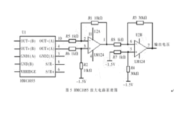 各向異性磁阻(AMR)傳感器由惠斯頓電橋進行工作,並且傳感器輸出電壓很小,需要放大才能進行A/D轉換。下麵以HMC1052為例進行分析。HMC1052的靈敏度為±1.0mV/V/高斯,電橋偏置電壓值為±1mV/V。在橋路電壓3V和625毫高斯最大的磁場強度下,橋路偏置電壓為:
