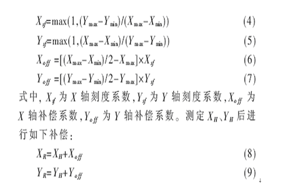 因為硬鐵影響是恒定的,所以可以采用標定的方法消除幹擾。標定的方法為:將車載羅盤在水平麵旋轉一周,記錄下X、Y兩個方向的最大和最小值(Xmax、Ymax)、(Xmin、Ymin),代入式(4)、(5)、(6)、(7)中,可以得到Xo f f 、Yo f f 。