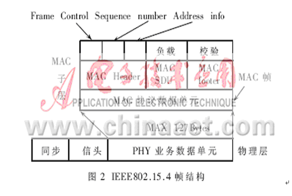 IEEE802.15.4的MAC協議包括以下功能:設備間無線鏈路的建立、維護和結束;確認模式的幀傳送與接收;信道接入控製;幀校驗;預留時隙管理;廣播信息管理。MAC子層提供兩個服務與高層聯係,即通過兩個服務訪問點(SAP)訪問高層。通過MAC通用部分子層SAP(MCPS-SAP)訪問MAC數據服務,用MAC層管理實體SAP(MLME-SAP)訪問MAC管理服務。這兩個服務為網絡層和物理層提供了一個接口。靈活的MAC幀結構適應了不同的應用及網絡拓撲的需要,同時也保證了協議的簡潔。MAC幀的通用格式如圖2所示。