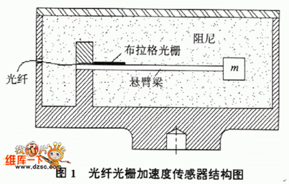 圖1是光纖光柵加速度傳感器機械結構簡圖,圖中懸臂梁一端固定在機座上,另一端放有質量塊m,把光纖光柵兩端點粘貼在懸臂梁的固定端附近,有利於光柵在受力時應變均勻.在測量物體振動時,把機座固定在振動源上,振動源與機座同時振動,從而引起質量塊mdezhendong,zaiguanxinglidezuoyongxiaxuanbiliangchanshengshousuoheshenchang,daidongguangxianguangzhachanshengyingbiancongeryinqibulagebochangdebianhua,tongguotancebulagebochangdebianhualaishixianzhendongdeceliang.