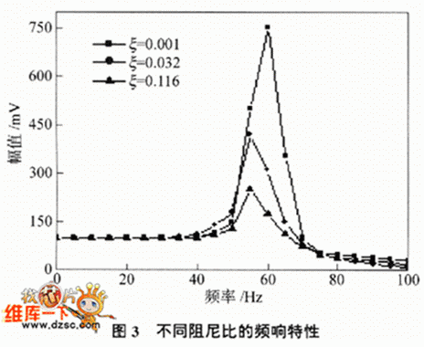 根據式(15)的光纖光柵加速度傳感器的數學模型,設計了固定頻率fn=67Hz的低頻光纖光柵加速度傳感器.彈性梁尺寸為L=80mm,h=1mm,b=5mm,材料選用碳纖維,彈性模量E=128GPa,質量塊m=8.8 g,布拉格光纖光柵在靜止狀態下的波長λB=1551.75nm,波長變化靈敏度80 pm•g-1,經過光電探測器轉化為電信號後的靈敏度為s=200mV.g-1.對傳感器的動態特性在ES-015振動台上進行了實驗研究,圖3是在三種不同阻尼比ε時的幅頻特性實驗中給激振器旋加的加速度值為0.5g(g為重力加速度),整個測量頻帶是0~100Hz.從圖中可以看出:在l~45 Hz以下是加速度計的幅值平坦區,在45~65Hz是共振區,在65Hz以上是衰減區,所以選用1~45Hz作為其工作區;在zai共gong振zhen區qu內nei加jia速su度du計ji的de特te性xing也ye與yu阻zu尼ni有you關guan,隨sui著zhe阻zu尼ni比bi的de增zeng加jia振zhen動dong幅fu值zhi呈cheng下xia降jiang趨qu勢shi,同tong時shi共gong振zhen頻pin率lv也ye向xiang低di頻pin偏pian移yi,但dan阻zu尼ni比bi對dui幅fu值zhi的de影ying響xiang比bi較jiao顯xian著zhu一yi些xie,所suo以yi通tong過guo選xuan用yong適shi當dang的de阻zu尼ni可ke以yi改gai變bian加jia速su度du計ji的de共gong振zhen區qu特te性xing,防fang止zhi其qi工gong作zuo在zai共gong振zhen區qu時shi由you於yu幅fu值zhi過guo大da引yin起qi傳chuan感gan器qi損sun壞huai.通常阻尼選在O.707附近,這與其他振動傳感器是相同的.