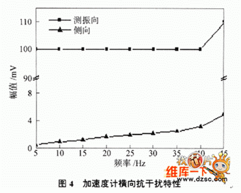 對單自由度的低頻光纖光柵加速度計來說,橫向抗幹擾特性也是一項重要指標.實驗在加速度計的測振方向以及與其垂直的側向分別加0.5g的加速度,在5~45 Hz的頻帶範圍內對兩個方向的振動值進行了對比,測量結果如圖4所示.從圖中可以看出,在加速度計的測振方向激振時加速度計測量輸出維持在100 mV 附近,而在與測振垂直方向激振時輸出在1~4mV範圍內,其橫向抗幹擾能力達40 dB.可見此種設計方案可以有效降低橫向幹擾的影響.
