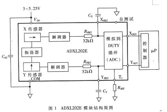 ADXL202采用3V直流電源供電,為降低電源對傳感器的幹擾,在引腳VDD和公共接地端COM之間需連接O.1μF的去耦電容。由於芯片與微處理器共用一個供電電源,在電源與VDD間需增加一個100Ω的電阻,以減小數字信號對傳感器輸出信號的幹擾。