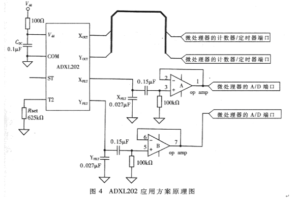 汽車防盜中,車體傾斜角度的測量要求其信號的噪聲必須很小,這就要限製信號帶寬。而對於振動的測量,則需要10~200Hz的較寬信號範圍。首先,將XFILY、YFILT引腳的濾波電容CX、CY設定為0.027μF,這樣輸出的數字、模擬信號的帶寬全都限製在200Hz以下,再將ADXl202輸出的帶寬為200Hz的數字和模擬信號分別經過低通濾波和高通濾波,就可以獲得傾斜、振動監測所需帶寬的信號。將ADXL202同時作為振動測量和傾角測量傳感器的方案原理圖如圖4所示。