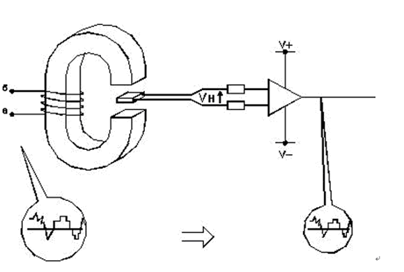 圖1.位於磁性電路間隙中的霍爾發生器把一次電流產生的磁場轉換成成比例的霍爾電壓。