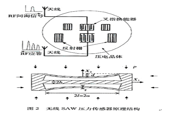 當傳感器表麵有壓力作用時,無線SAW壓ya力li傳chuan感gan器qi的de壓ya電dian薄bo膜mo就jiu會hui產chan生sheng形xing變bian,薄bo膜mo材cai料liao的de應ying變bian會hui使shi得de聲sheng表biao麵mian波bo傳chuan播bo速su度du發fa生sheng變bian化hua,從cong而er使shi聲sheng表biao麵mian波bo的de中zhong心xin諧xie振zhen頻pin率lv發fa生sheng變bian化hua。通tong過guo無wu線xian檢jian測ceSAW壓ya力li傳chuan感gan器qi的de中zhong心xin諧xie振zhen頻pin率lv變bian化hua,就jiu能neng得de到dao壓ya力li變bian化hua的de數shu據ju。假jia設she溫wen度du對dui兩liang個ge單dan端duan諧xie振zhen器qi的de中zhong心xin諧xie振zhen頻pin率lv影ying響xiang很hen小xiao,則ze兩liang諧xie振zhen器qi中zhong心xin頻pin率lv差cha的de變bian化hua與yu所suo測ce壓ya力li之zhi間jian的de關guan係xi式shi可ke表biao示shi為wei