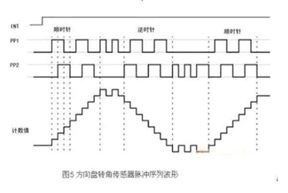 方向盤轉角傳感器的輸出為正交編碼脈衝。正交編碼脈衝包含兩個脈衝序列,有變化的頻率和四分之一周期(90°)的固定相位偏移,如圖5所示。通過檢測2路信號的相位關係可以判斷為順時針方向和逆時針方向,並據此對信號進行加/jianjishu,congerdedaodangqiandejishuleijizhi,yejifangxiangpandejueduizhuanjiao,erzhuanjiaodebianhualvjijiaosudu,zeketongguoxinhaopinlvcechu。lingwai,fangxiangpanzhuanjiaochuanganqiyouyigelingweishuchuxinhao,dangfangxiangpanzaizhongjianweizhishi,gaixinhaoshuchu0V,否則輸出5V,通過該信號,可對絕對轉角進行在線校準。