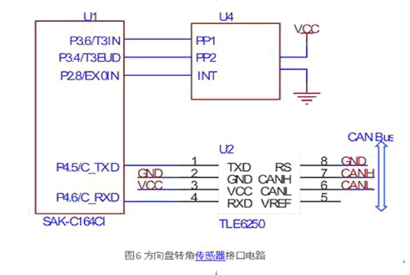C164CI與方向盤轉角傳感器的接口電路如圖6所示。片內內置增量編碼的正交解碼器,該解碼器使用定時器3的兩個引腳(T3IN、T3EUD)作為正交脈衝的輸入,在正確設置相關寄存器後,定時器3的數據寄存器的值與方向盤轉角成正比,故可方便的計算轉角,本文所使用的方向盤轉角傳感器每一圈對應44個脈衝,設定時器3的數據寄存器為T3,則絕對轉角為。